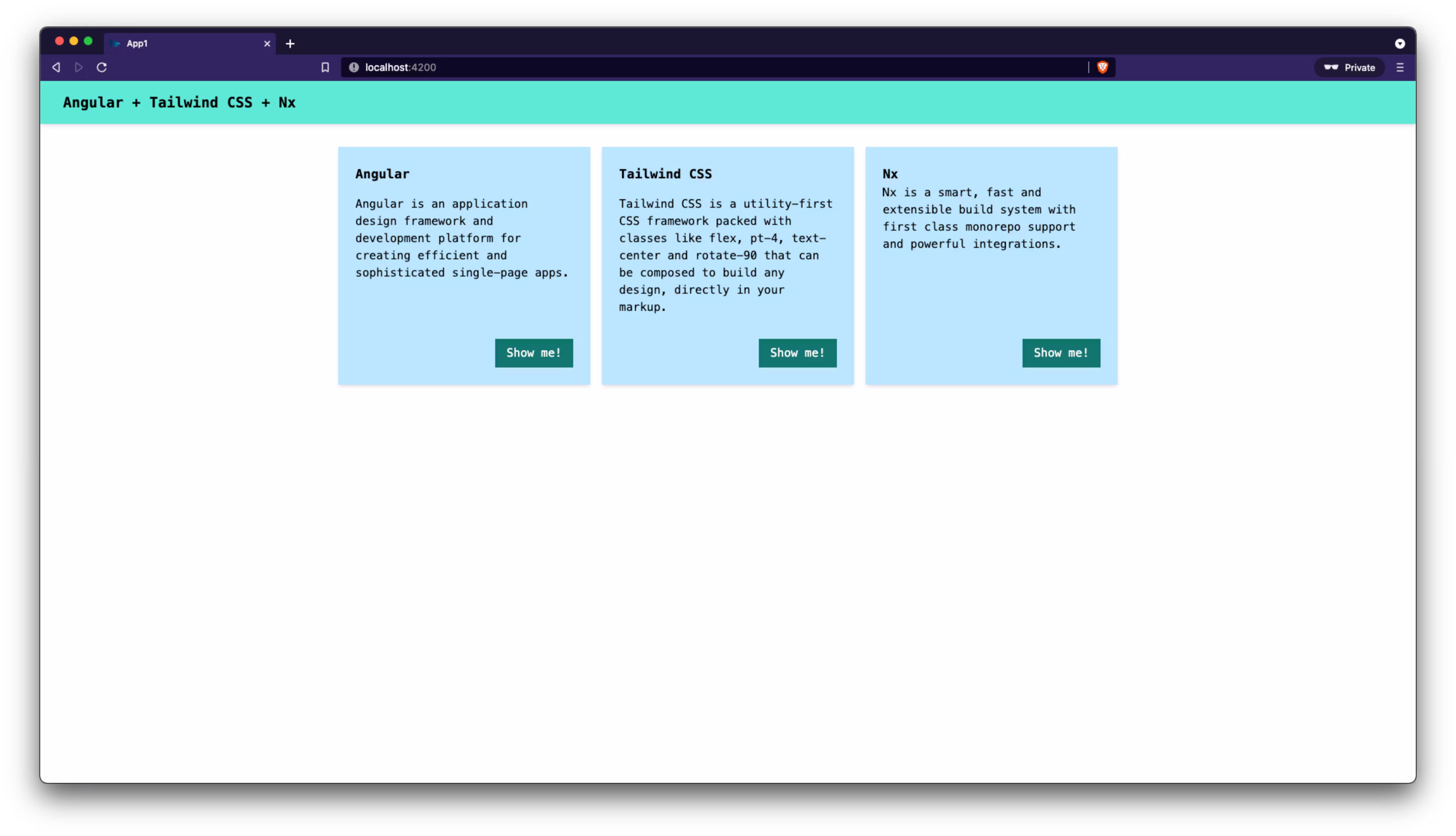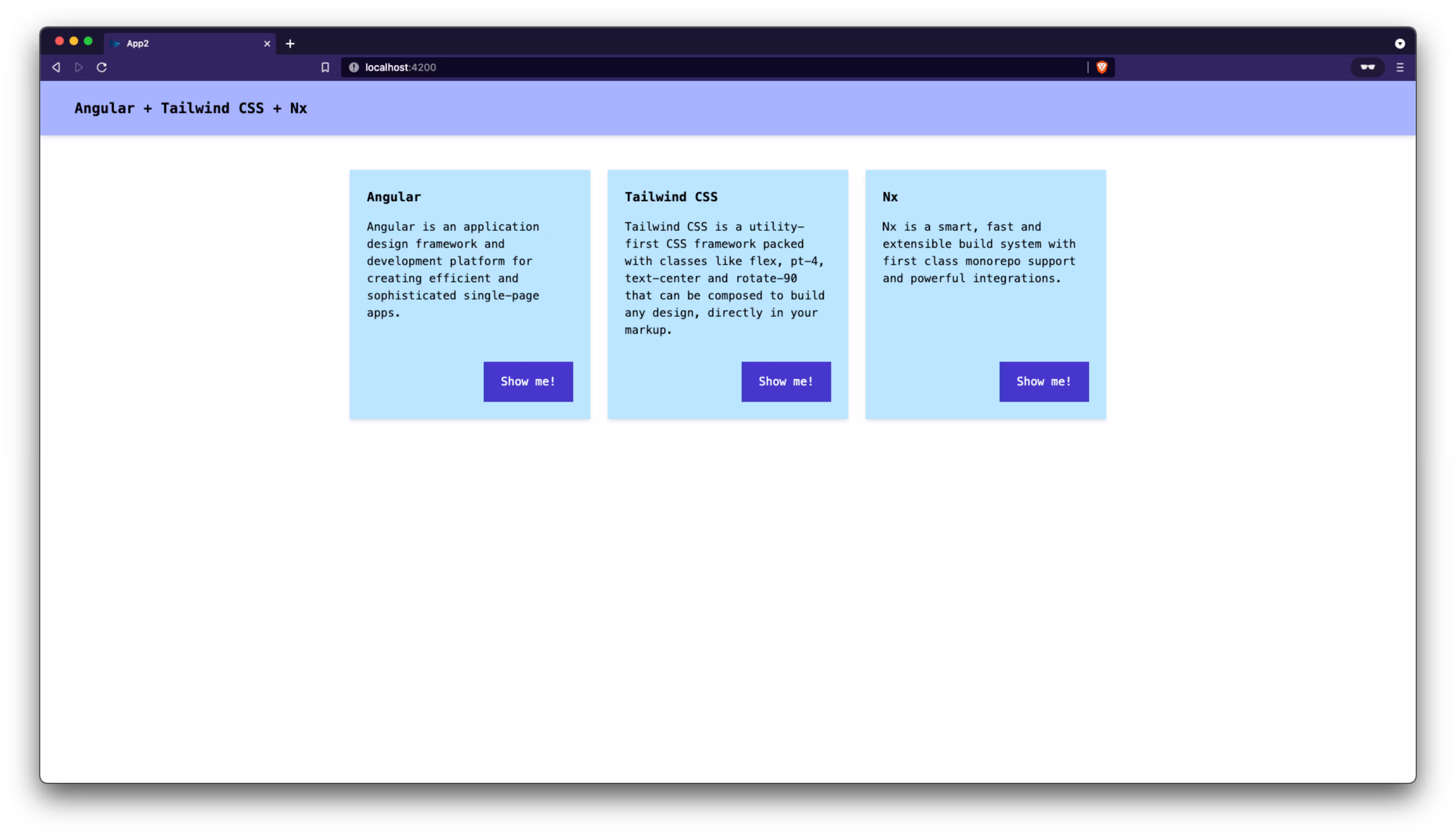2 <header class="px-xl py-md bg-primary-light text-xl font-bold shadow-md">Angular + Tailwind CSS + Nx</header>